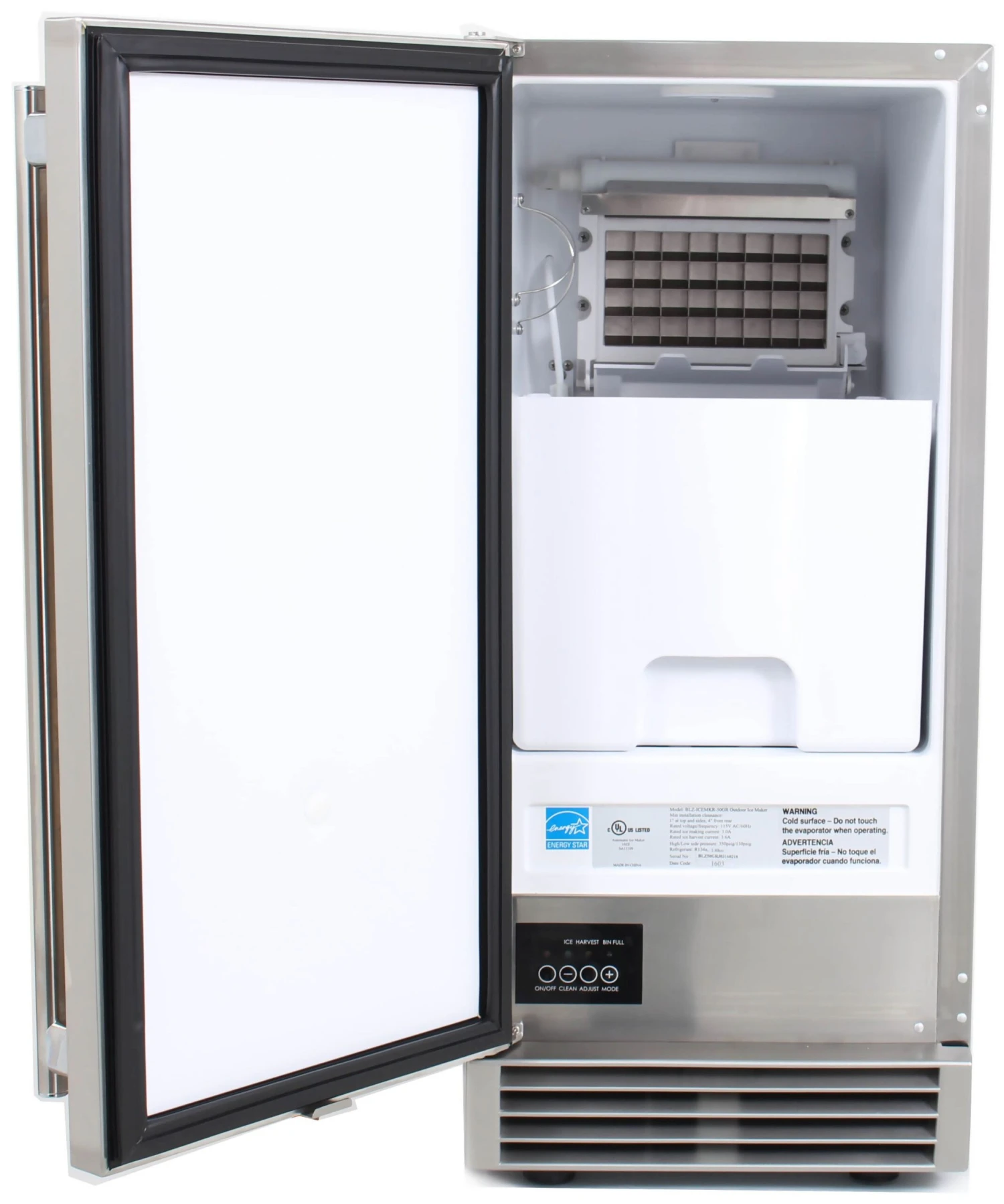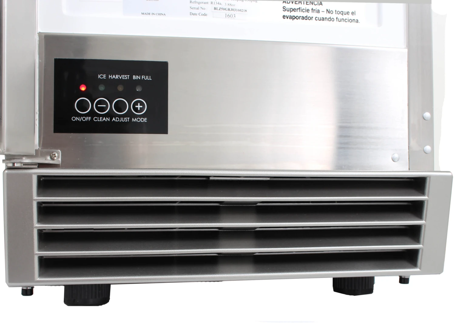 Outdoor entertaining is more enjoyable and convenient when you have everything in your outdoor kitchen. This outdoor ice maker eliminates unnecessary trips inside to get ice for your beverages. The Blaze outdoor ice maker can produce up to 50 pounds of cube ice per day and can hold 25 pounds in its removable bin. Inside the ice maker, a cool blue LED illuminates the contents, making things easy to see. The ice maker also includes a self cleaning mode and convenient one button operation. The Blaze ice machine features an in-line water filter which filters out impurities, ensuring the ice production is free of contaminants. The unit is made from durable stainless steel and features a reversible door to suit your specific needs. The front venting design allows it to be used in a built-in application, or it can be used as a freestanding unit. The bottom of the ice maker is equipped with four leveling legs for a perfect fit. It operates on environmentally friendly R134a refrigerant, carries an Energy Star rating and UL listing for outdoor use. This ice maker includes a stainless steel ice scoop, drain line and water line. Blaze Outdoor Products warrants this product to be free from defects in materials and workmanship for a period of one (1) year from the date of original purchase.