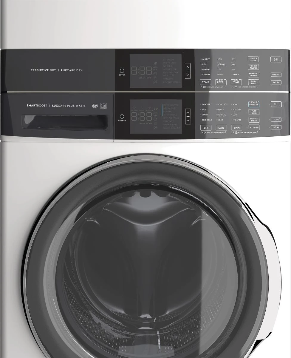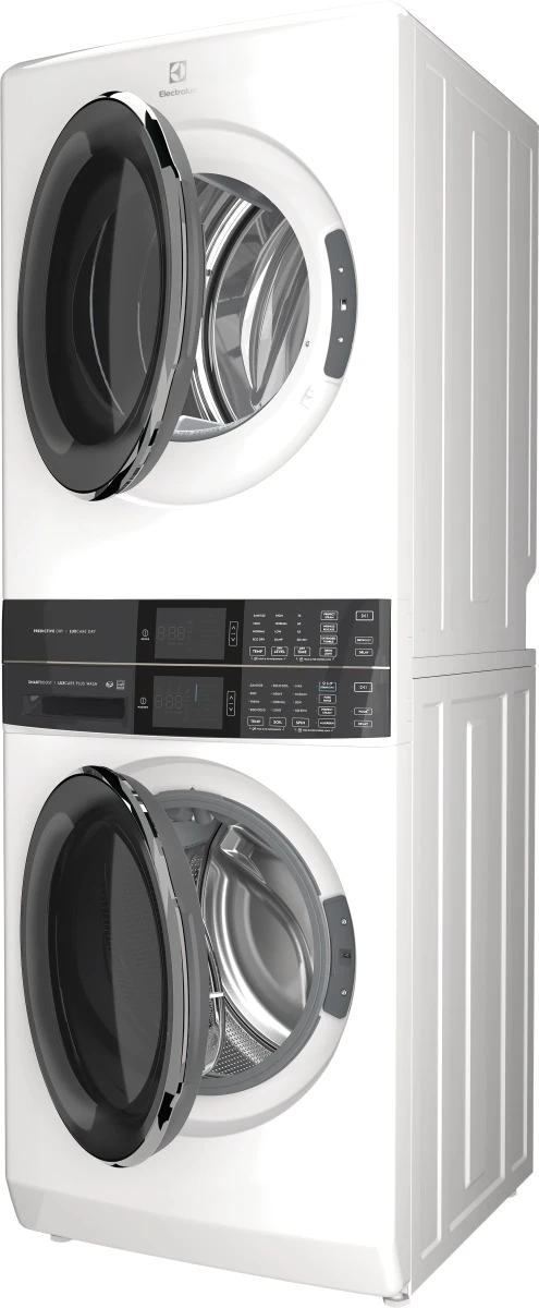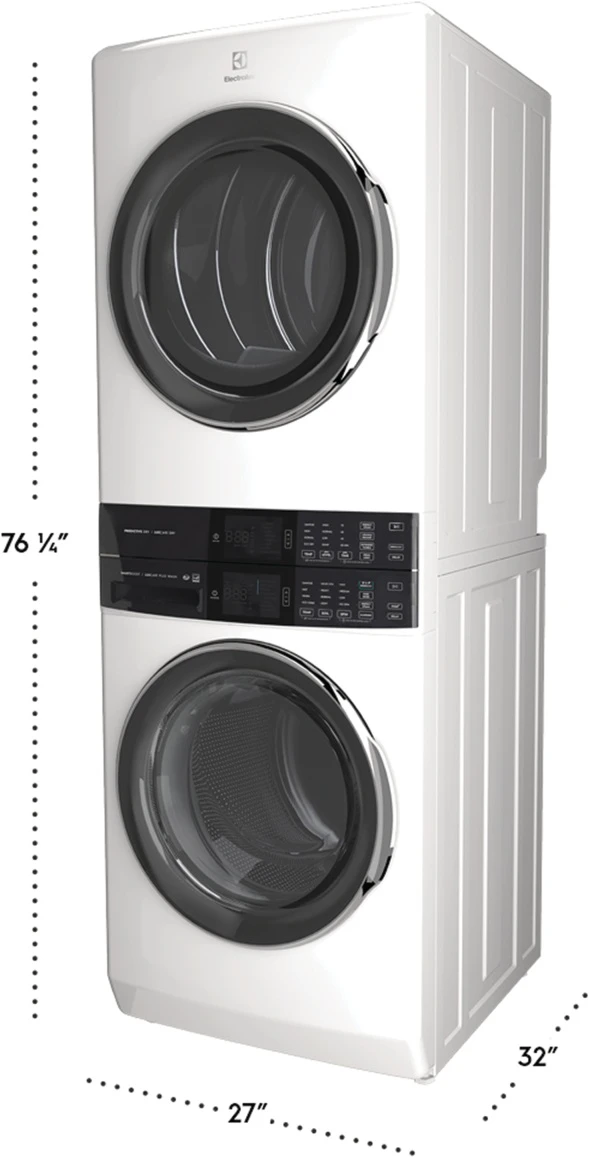 Fully integrated vertical layout takes up half the floor space of a traditional washer/dryer for greater laundry room flexibility, or to fit easily into most closets and other tight spaces. Features a full-sized washer on bottom, a full-sized dryer on the top, and a control panel in the middle for easy access.