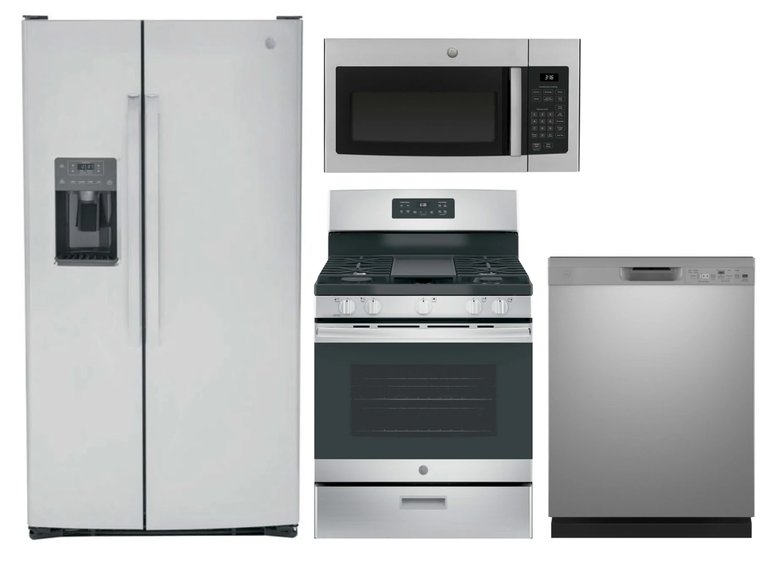 GE Kitchen 4 Piece Package 324 GFE28GYNFS-JGB735SPSS-GDP630PYRFS-JVM7195SKSS