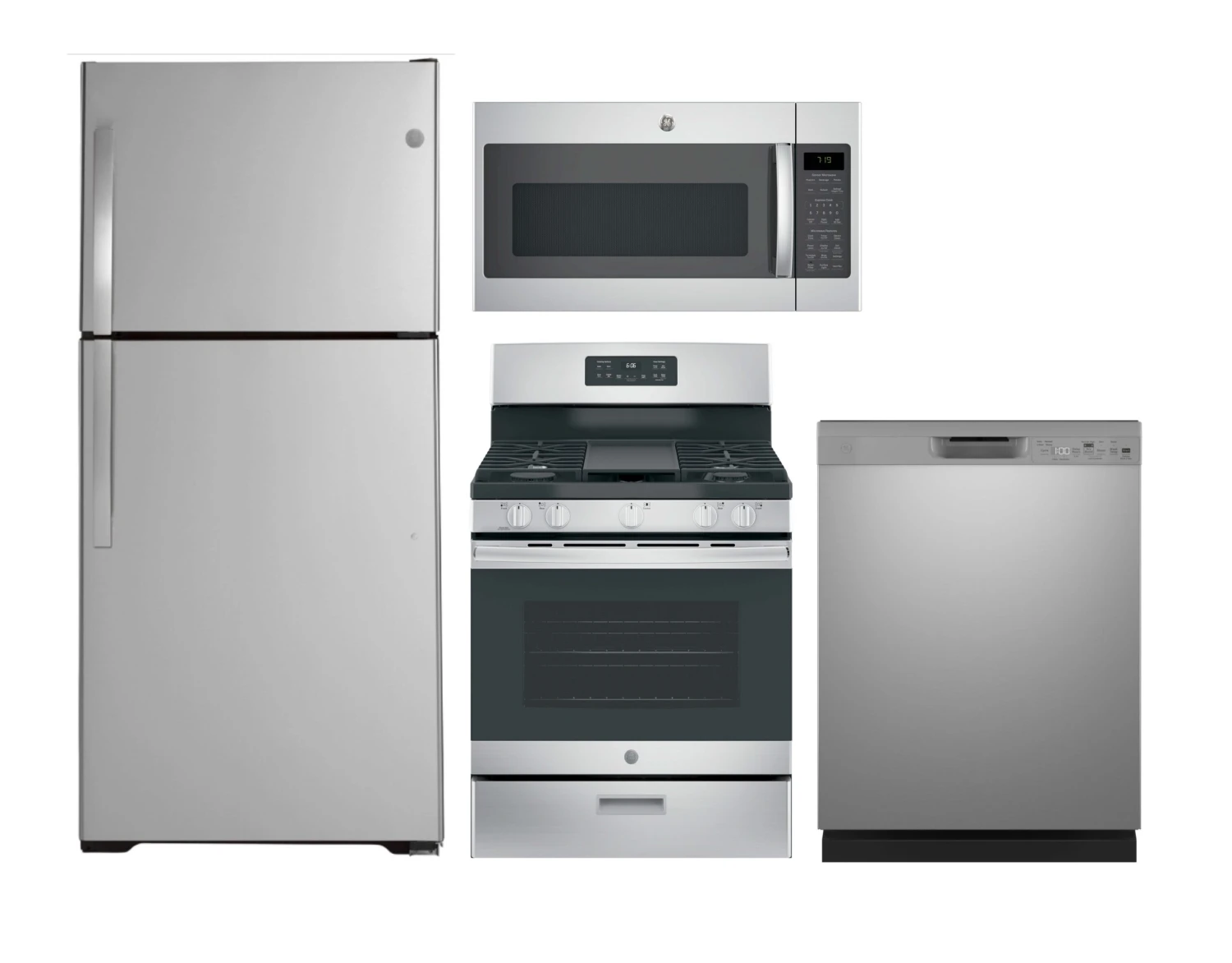 GE Kitchen 4 Piece Package 324 GFE28GYNFS-JGB735SPSS-GDP630PYRFS-JVM7195SKSS
