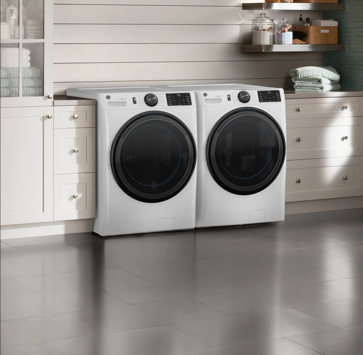 GE® 5.0 Cu. Ft. White Front Load WasherGE® 7.8 Cu. Ft. White Electric Dryer