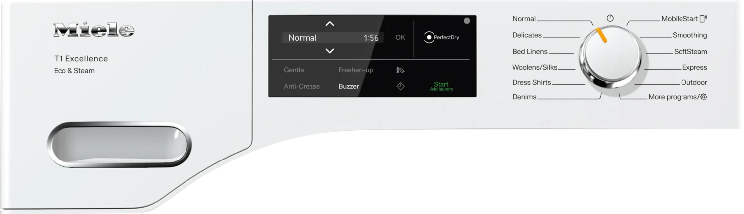T1 Heat-pump tumble dryer with Miele@home and SteamFinish for smart laundry care.