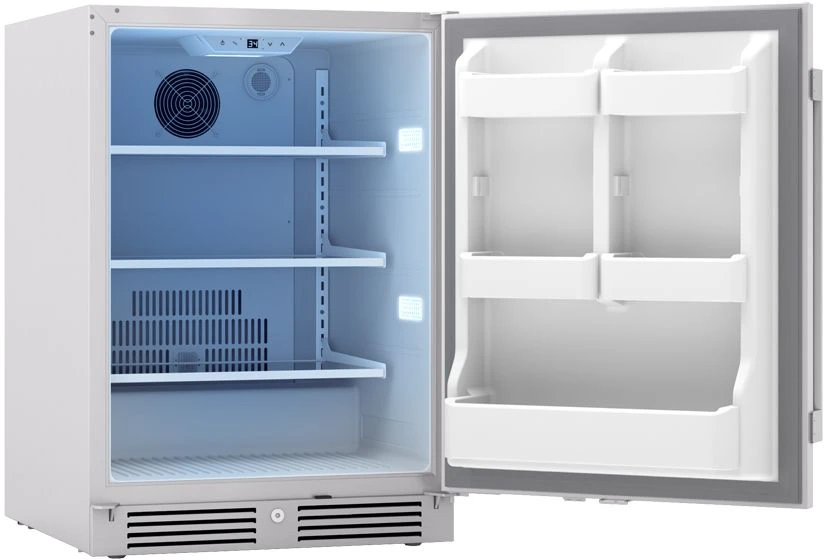 Features include party-ready perks like adjustable shelving, customizable door shelving — accommodating two-liter and gallon jugs — all-white interior, sleek stainless steel exterior, white LED lighting and door lock.